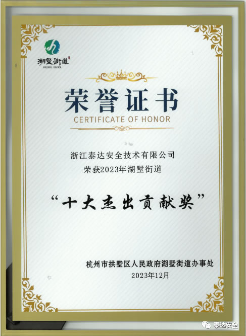 喜報:浙江泰達安全技術有限公司喜獲2023年度湖墅街道“十大杰出貢獻獎”榮譽稱號